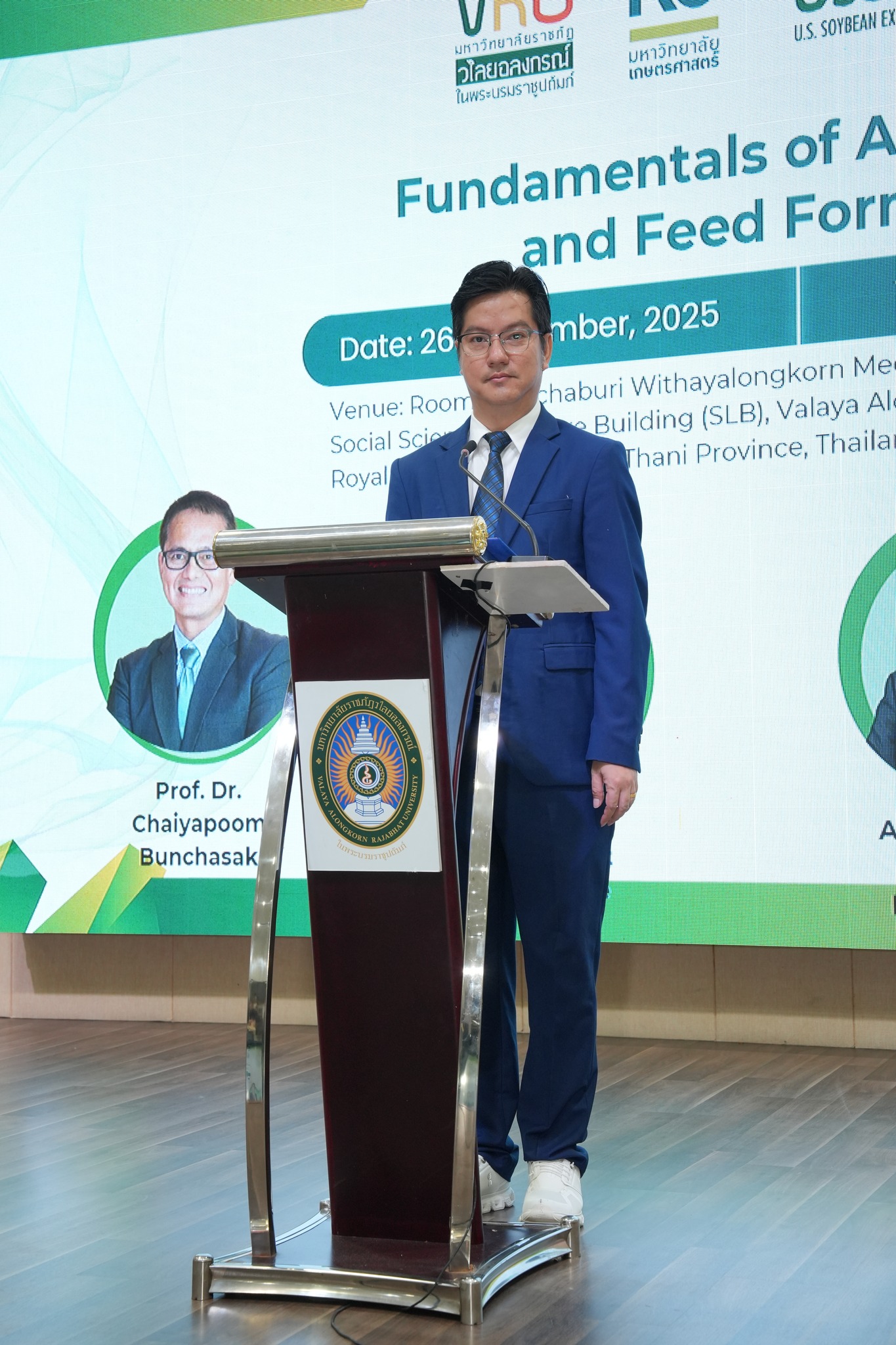 ผศ.ดร.ภิศักดิ์ กัลยาณมิตร รองอธิการบดีเป็นประธานเปิดการอบรมเชิงปฎิบัติการ “หลักสูตรพื้นฐานทางโภชนาการสัตว์และการจัดสูตรอาหารสัตว์ Fundamentals of Animal Nutrition and Feed Formulation Training” ณ ห้องประชุมเพชรบุรี 2 ชั้น 3 อาคารเรียนรวมสังคมศาสตร์
